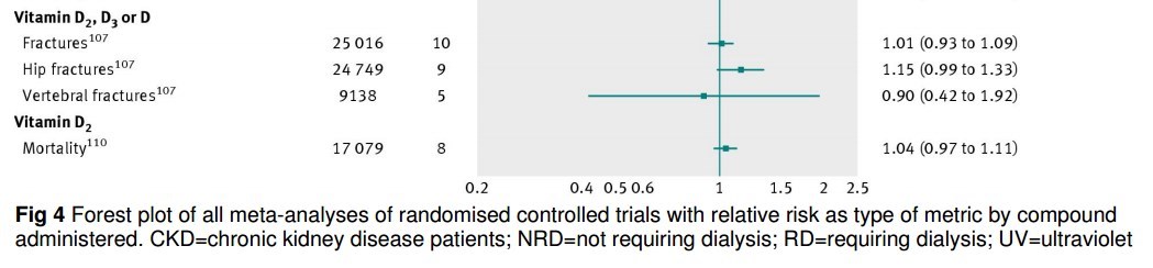 Taking a different approach, Chowdhury and colleagues (doi:10.1136/bmj.g1903) provide a new meta-analysis of observational and trial data relating vitamin D (given alone as either the D2 or D3 preparation), to risk of all cause mortality.13 Their observational analyses unsurprisingly confirmed low 25-hydroxyvitamin D to be associated with elevated risk of multiple adverse outcomes. However, their analysis of trials provides the most noteworthy finding: whereas D2 supplementation did not seem to reduce all cause mortality (relative risk 1.04, 95% confidence interval 0.97 to 1.11), D3 supplementation did (0.89, 0.80 to 0.99). A previous Cochrane review also reported a reduction in all cause mortality with the use of D3, albeit of lower magnitude (relative risk 0.94, 0.91 to 0.98).14