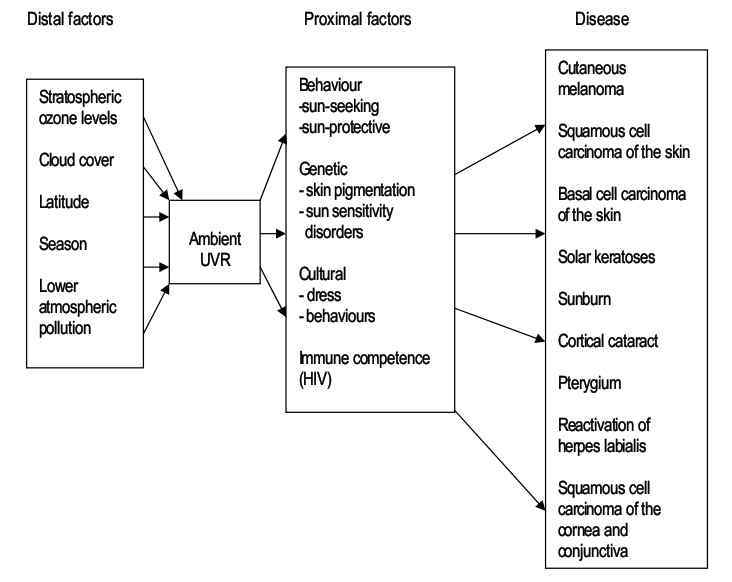 Figure 2.1 Schematic diagram of the relation between ultraviolet radiation (UVR) exposure and the burden of disease