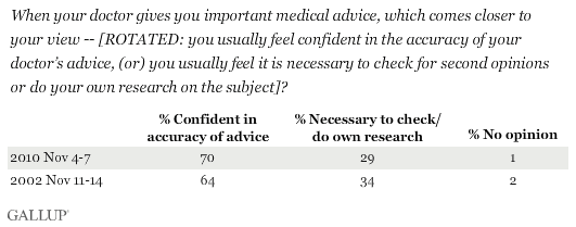 PRINCETON, NJ — Despite the advent of health websites and other widely available sources providing medical research and information, 70% of Americans feel confident in the accuracy of their doctor's advice, and don't feel the need to check for a second opinion or do additional research. Americans' confidence in their doctor is up slightly from eight years ago.