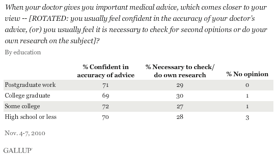November 2010: When Your Doctor Gives You Important Medical Advice, Which Comes Closer to Your View — You Usually Feel Confident in the Accuracy of Your Doctor's Advice, or You Usually Feel It Is Necessary to Check for Second Opinions or Do Your Own Research on the Subject? By Education