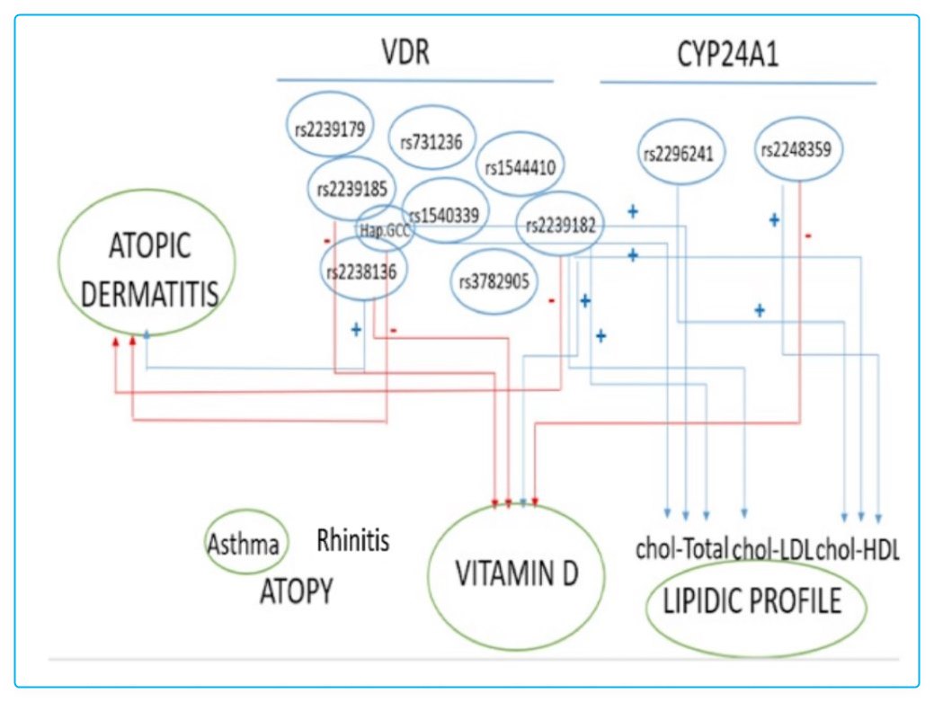 Background: Atopic dermatitis (AD) is the most prevalent inflammatory skin disorder, characterized by impaired epidermal barrier function and an altered immune response, both of which are influenced by vitamin D deficiency. Single-nucleotide polymorphisms (SNPs) in VDR and CYP24A1 have been previously associated with AD.Objective: We sought to characterize the associations between the VDR and CYP24A1 polymorphisms and the vitamin D and lipid biochemical profile in children diagnosed with AD.