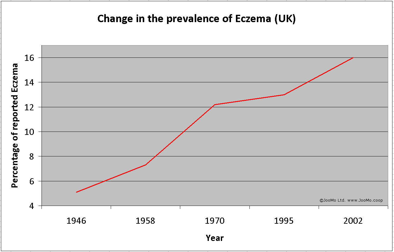 None (controls) = 53, Mild = 33, Moderate = 31.5, Severe = 21 - Change in the prevalence of Eczema since the 2nd World War UK published 2012: has the following chart