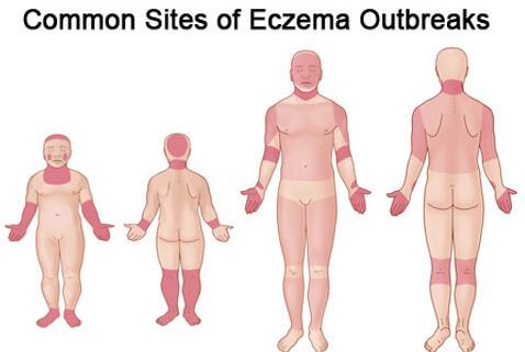 Eczema is used as a general term for many types of skin inflammation (dermatitis) and allergic-type skin rashes. There are different types of eczema, like allergic, contact, irritant, and nummular eczema. Several other forms have very similar symptoms. The diverse types of eczema are listed and briefly described below. Atopic dermatitis is typically a more specific set of three associated conditions occurring in the same person including eczema, allergies, and asthma. Not every component has to be present at the same time, but usually these patients are prone to all of these three related conditions.