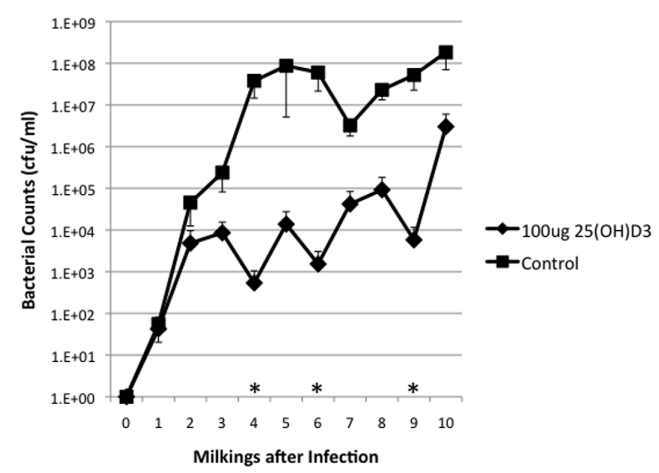 The 25-hydroxyvitamin D(3) treated animal showed significantly lower bacterial counts in milk and showed reduced symptomatic affects of the mastitis.