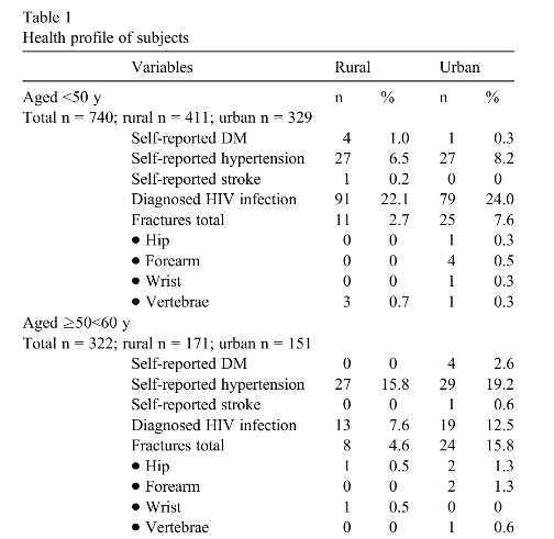 We aimed to assess the prevalence of risk factors for low bone mass in 1261 black women from rural and urban areas in the North West Province of South Africa (Prospective Urban and Rural Epidemiology–South Africa project). Fasting blood samples were taken; and participants were interviewed to complete questionnaires on self-reported diseases, fractures, and dietary intakes. Bone health markers were assessed in a subgroup of 658 women older than 45 years.