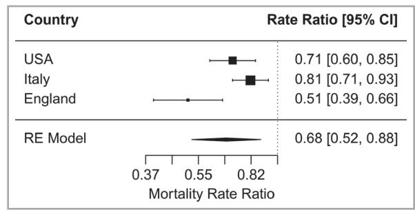 The mortality rate ratio (MRR) in the USA falls by 29% [95% confidence interval (CI) 40% to 15%) per 100 kJ m–2 increase in mean daily UVA. We replicated this in independent studies in Italy and England and estimate a pooled decline in MRR of 32% (95% CI 48% to 12%) per 100 kJ m–2 across the three studies.