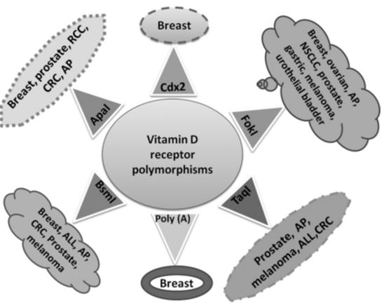 Materials and Methods: A systematic search of PubMed database (2015 through mid-2017) was conducted to provide a comprehensive overview of this clinical arena. Results: Studies on the association of VDR polymorphisms FokI, BsmI, TaqI, and ApaI and cancer have suggested the involvement of VDR polymorphism in tumorigenesis.