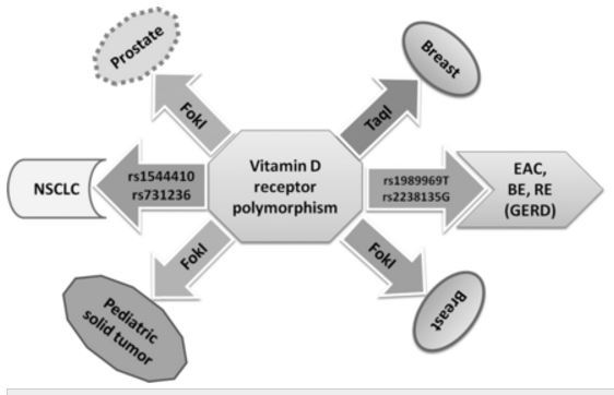 The results of various studies suggest the crucial role of VDR polymorphism (mainly FokI, ApaI, BsmI, and Taql) in tumorigenesis of various cancer types by affecting vitamin D metabolism and the cellular response to vitamin D. From the above-discussed studies, it is also obvious that the association between VDR polymorphism and tumorigenesis varies with