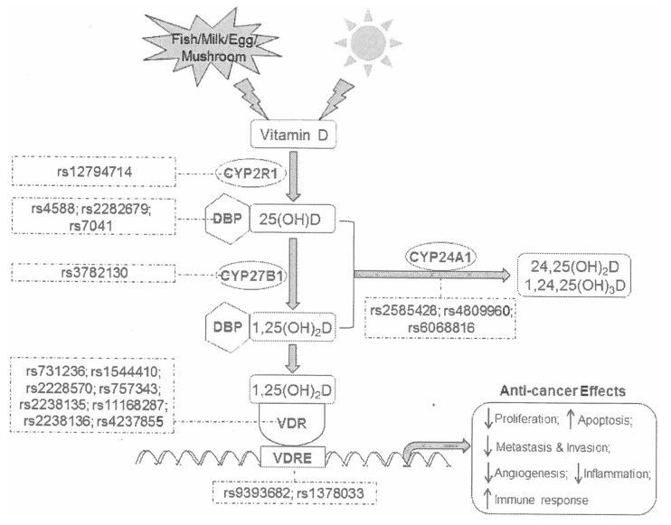 Polymorphisms have been found in genes involved in vitamin D synthetic and catabolic pathways. The rsl2794714 polymorphism at CYP2R1, which encodes an enzyme that hydroxylates vitamin D to 25(OH)D, was associated with a 1.8 ng/ml decrease in serum 25(OH)D levels per minor allele [34]. A separate Mendel ian randomization study associated this rsl2794714 SNP with a reduction in 25(OH)D by 1.2 ng/ml for each risk allele [40]. This, in turn was linked to increased ovarian cancer risk among European- ancestry women. This SNP was also associated with increased colorectal cancer risk in African Americans [41].