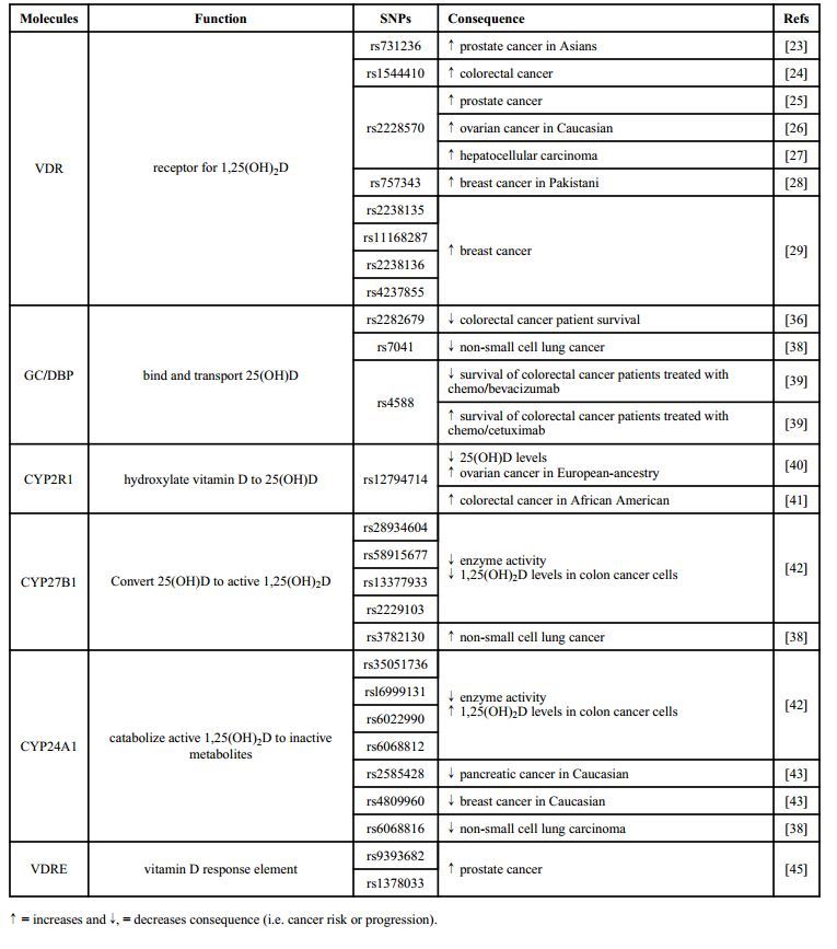Overall, the above studies of polymorphisms of the vitamin D-associated pathways, including VDR, GC, CYP2R1, CYP27B1, and CYP24A1 show SNP heritability could regulate the activity and levels of l,25(OH)2D and can impact on cancer risk. However, not all vitamin D-associated SNPs have been linked to cancer risk and those that have do not predict risk to all cancers. For example, a study of SNPs in women showed that polymorphism in the DHCR7gene (rs11234027) encoding an enzyme that diverts metabolism from vitamin D to cholesterol, CYP2R1(rs7944926) and in GC(rs2282679) were not associated with an increased risk of breast, colorectal or lung cancer [46].Clinical trials involving treatment with vitamin D metabolites