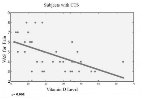 Vitamin D level was significantly lower in the mild CTS group P=0.002 (vs controls) - Does vitamin D deficiency trigger carpal tunnel syndrome? Nov 2016 YES