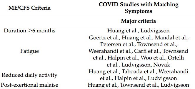 - Long COVID and Myalgic Encephalomyelitis/Chronic Fatigue Syndrome (ME/CFS)-A Systemic Review and Comparison of Clinical Presentation and Symptomatology - April 2021  PDF