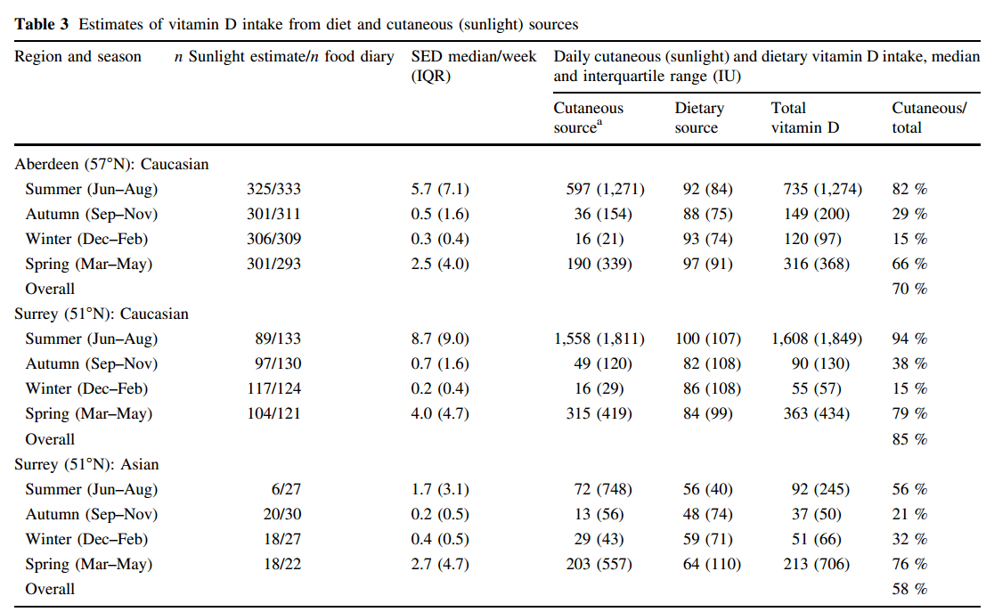 For many parts of the world there is a period when there is insufficient intensity of UVB to make vitamin D, which is reflected by a clear seasonal variation in vitamin D status.