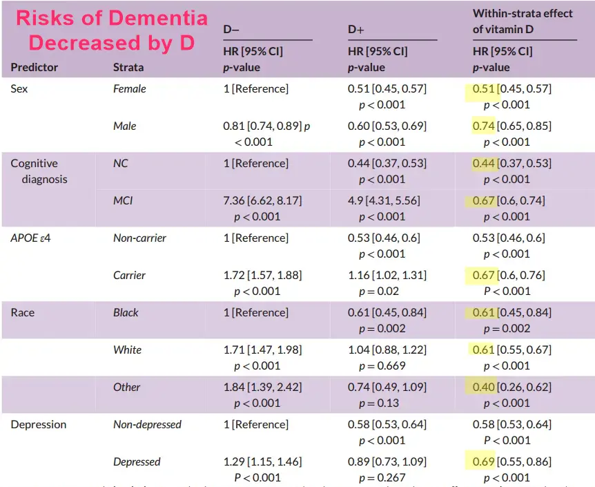 Methods: Baseline exposure to vitamin D was considered D+; no exposure prior to dementia onset was considered D-. Kaplan-Meier curves compared dementiafree survival between groups. Cox models assessed dementia incidence rates across groups, adjusted for age, sex, education, race, cognitive diagnosis, depression, and apolipoprotein E (APOE) z4. Sensitivity analyses examined incidence rates for each vitamin D formulation. Potential interactions between exposure and model covariates were explored.