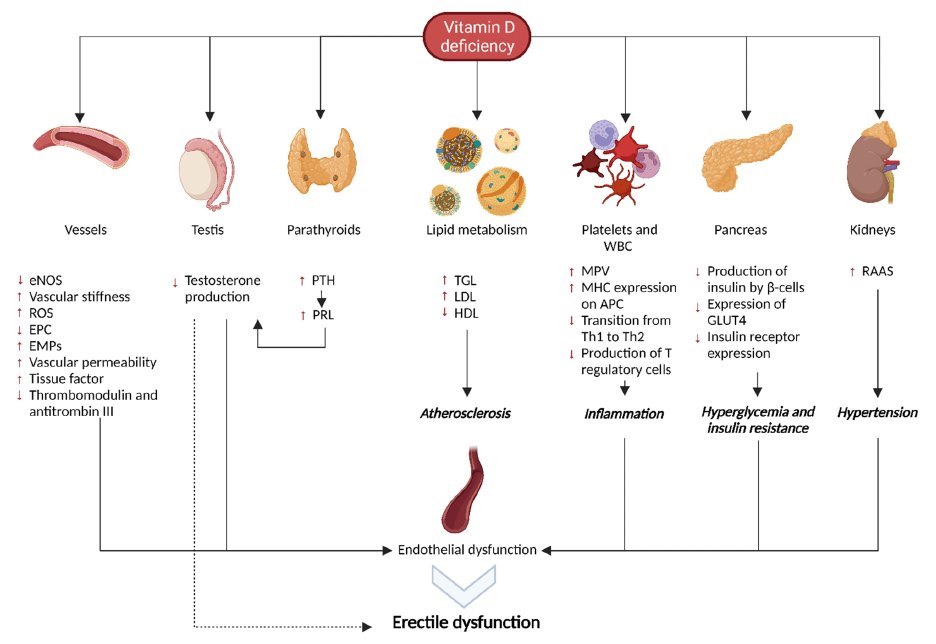 Furthermore, the ubiquitous distribution of the vitamin D receptor in the human body means that this hormone can also exert a beneficial effect on erectile function by interfering with those comorbidities significantly associated with ED, such as hypertension, diabetes mellitus, hypercholesterolemia, chronic kidney disease, and hypogonadism.