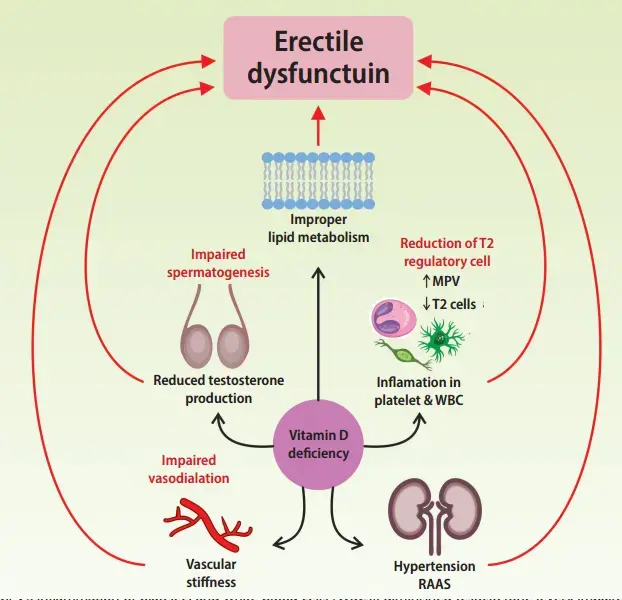 Both observational and interventional studies have established the presence of an association between VD levels and ED. This relation is more than a simple relation, because there are many risk factors (Figure 2) in the etiology of ED which might be directly caused by VDD.