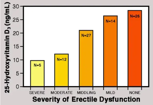 Finally, we found that eugonadal patients with severe ED have lower 25(OH)D3 levels than patients with mild ED. In conclusion, this meta-analysis suggests an association between vitamin D deficiency and the presence of severe forms of ED, independent of testicular function.