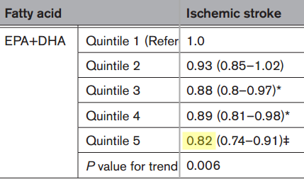 Among 183 291 study participants, there were 10 561 total strokes, 8220 ischemic strokes, and 1142 hemorrhagic strokes recorded over a median of 14.3 years follow-up. For eicosapentaenoic acid, comparing quintile 5 (Q5, highest) with quintile 1 (Q1, lowest), total stroke incidence was 17% lower (HR, 0.83 [CI, 0.76–0.91]; P<0.0001), and ischemic stroke was 18% lower (HR, 0.82 [CI, 0.74–0.91]; P<0.0001). For docosahexaenoic acid, comparing Q5 with Q1, there was a 12% lower incidence of total stroke (HR, 0.88 [CI, 0.81–0.96]; P=0.0001) and a 14% lower incidence of ischemic stroke (HR, 0.86 [CI, 0.78–0.95]; P=0.0001). Neither eicosapentaenoic acid nor docosahexaenoic acid was associated with a risk for hemorrhagic stroke. These associations were not modified by either baseline history of AF or prevalent CVD.CONCLUSIONS: