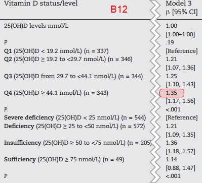Higher Vitamin D is 35% more likely if higher Vitamin B12