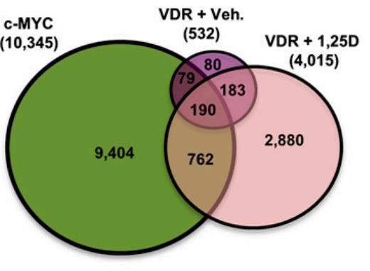 Results of a comparative analysis of overlap of genomic binding sites from ChIP sequencing studies of c-MYC and the VDR (from cells treated with vehicle [Veh] or 100 nM 1,25D for 36 h) performed in related lymphoblastoid cell lines.