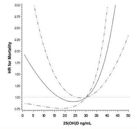 High mortality if > 30 ng of vitamin D + HIV + Malaira