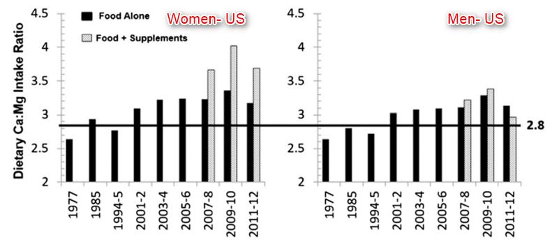 US calcium intakes increased at a rate 2-2.5 times that of magnesium intakes, resulting in a dietary calcium to magnesium intake ratio of >3.0. Calcium to magnesium ratios <1.7 and >2.8 can be detrimental, and optimal ratios may be ~2.0. Background calcium to magnesium ratios can affect studies of either mineral alone. For example, US studies (background Ca:Mg >3.0) showed benefits of high dietary or supplemental magnesium for CVD, whereas similar Chinese studies (background Ca:Mg <1.7) showed increased risks of CVD. Oral vitamin D is widely recommended in US age-sex groups with low dietary magnesium. Magnesium is a cofactor for vitamin D biosynthesis, transport, and activation; and vitamin D and magnesium studies both showed associations with several of the same chronic diseases. Research on possible magnesium and vitamin D interactions in these human diseases is currently rare. Increasing calcium to magnesium intake ratios, coupled with calcium and vitamin D supplementation coincident with suboptimal magnesium intakes, may have unknown health implications. Interactions of low magnesium status with calcium and vitamin D, especially during supplementation, require further study.Increased Ca/Mg ratio over time, especially for women figure 2