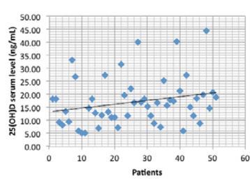 The mean vitamin D level was 17.06±9.13 ng/dL. Only 9.8% of the patients had optimal vitamin D levels; 66.66% of them had insufficient 25(OH)D levels, while 23.52% had deficient levels.