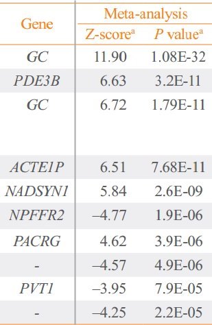 Methods: We included 12,642 subjects from three different genetic cohorts consisting of Korean participants. The GWAS was performed on 7,590 individuals using linear or logistic regression meta- and mega-analyses. After identifying significant single nucleotide polymorphisms (SNPs), we calculated heritability and performed replication and rare variant analyses. In addition, expression quantitative trait locus (eQTL) analysis for significant SNPs was performed.