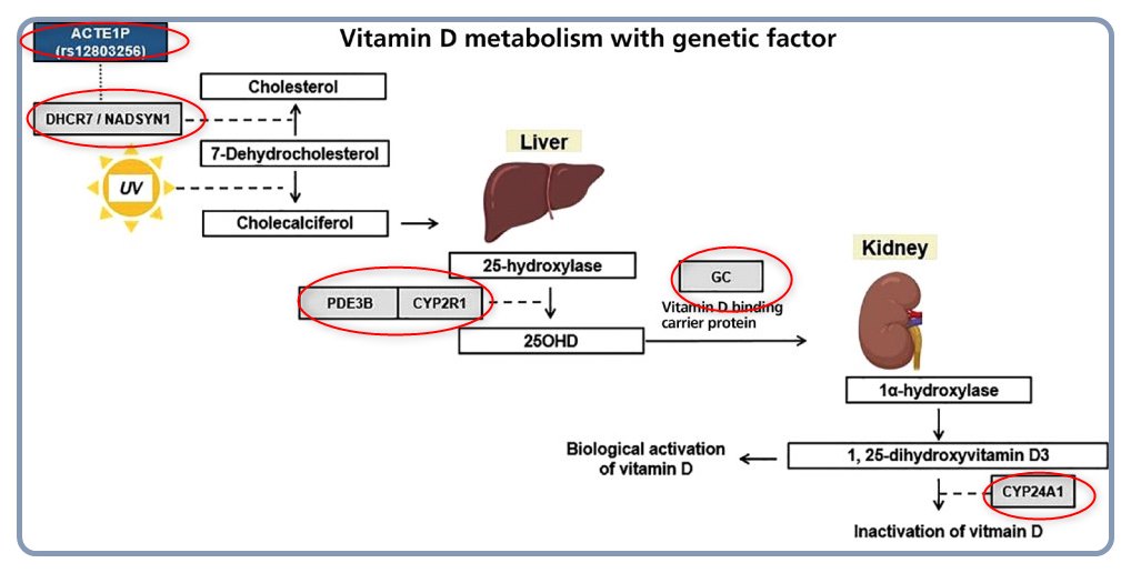 Conclusion: The genetic factors underlying vitamin D deficiency in Korea included polymorphisms in the GC, PDE3B, NADSYN1, and ACTE1P genes. The biological mechanism of a non-coding SNP (rs12803256) for DHCR7/NADSYN1 on vitamin D concentrations is unclear, warranting further investigations.