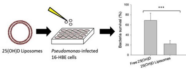 The influence of vitamin D3 and its metabolites calcifediol (25(OH)D) and calcitriol on immune regulation and inflammation is well described, and raises the question of potential benefit against bacterial infections. In the current study, 25(OH)D was encapsulated in liposomes to enable aerosolisation, and tested for the ability to prevent pulmonary infection by Pseudomonas aeruginosa. Prepared 25(OH)D-loaded liposomes were nanosized and monodisperse, with a negative surface charge and a 25(OH)D entrapment efficiency of approximately 23%. Jet nebulisation of liposomes was seen to yield an aerosol suitable for tracheo-bronchial deposition. Interestingly, 25(OH)D in either liposomes or ethanolic solution had no effect on the release of the proinflammatory cytokine KC from Pseudomonas-infected murine epithelial cells (LA-4); treatment of infected, human bronchial 16-HBE cells with 25(OH)D liposomes however resulted in a significant reduction in bacterial survival. Together with the importance of selecting an application-appropriate in vitro model, the current study illustrates the feasibility and practicality of employing liposomes as a means to achieve 25(OH)D lung deposition. 25(OH)D-loaded liposomes further demonstrated promising effects regarding prevention of Pseudomonas infection in human bronchial epithelial cells.