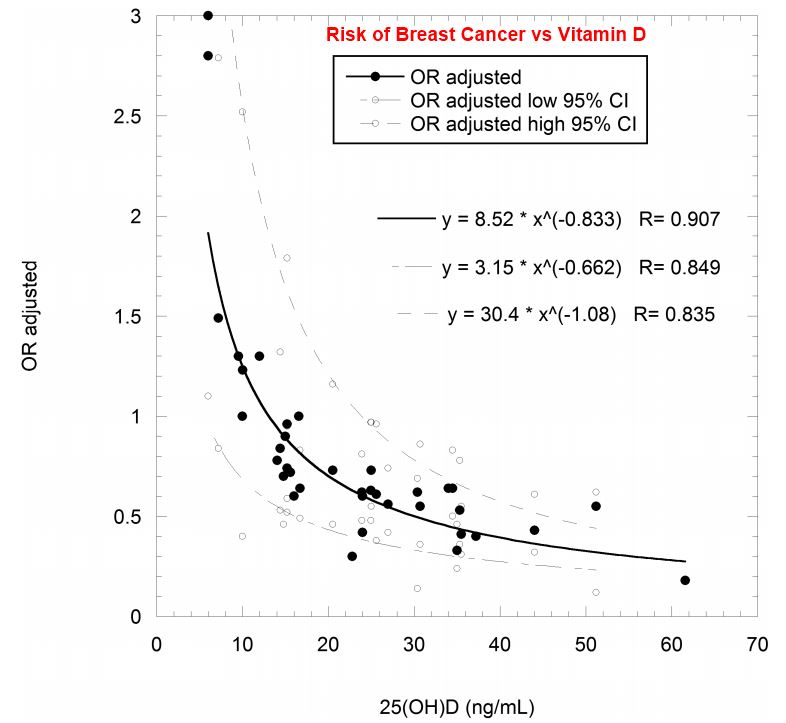 Many authors consider that case-control study findings may be confounded by reverse causation—i.e., low 25(OH)D concentration’s being a result of the life-style, or of physiological disturbances associated with the disease, rather than a cause of the disease [Hj. However, the results from 11 studies agree well, and odds ratios for case-control studies for breast and colorectal cancer align with a linear fit to the results from prospective studies with results plotted as a function of follow-up time. Both those facts argue against that contention [[4j. That the results for breast cancer can be used as a proxy for all-cancer incidence is supported by the finding that in ecological studies of cancer mortality rates in the U.S. for two periods, 19501969 and 1970-1994, the correlations with UVB doses are similar [[17]. Also, reductions in incidence of total, breast, colorectal, and invasive breast cancers in the Women’s Health Initiative study for women not taking vitamin D or calcium supplements prior to entry were similar [15]. However, should such differences emerge, this modeling study allows utilization of the available data.