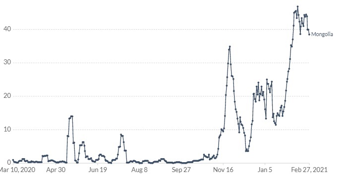 Mongolia COVID-19 case rate 40/day at the end of Feb 2021