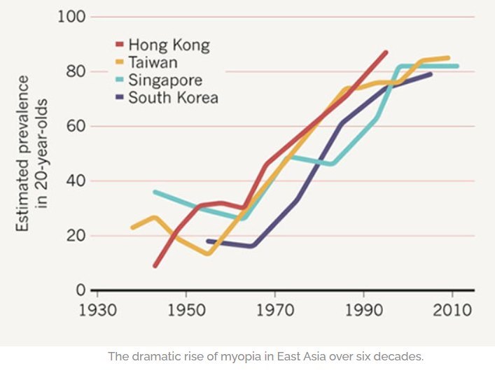 - " In East and Southeast Asia, where this shift is most dramatic, the proportion of teenagers and young adults with myopia has jumped from roughly a quarter to more than 80 percent in just over half a century"