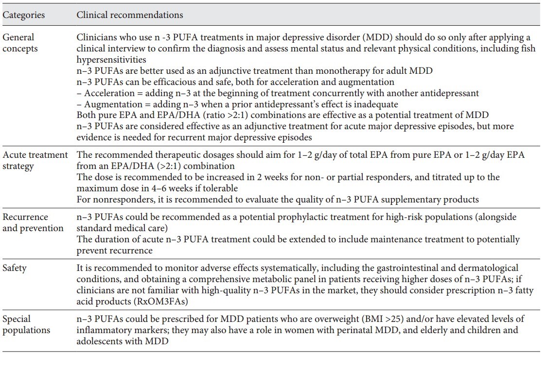 To conclude, the ISNPR provides the first practice guideline of n-3 PUFAs in depression treatment and emphasizes the importance of accurate clinical diagnosis and measurement-based psychopathological assessments practised in the therapeutic settings. Pure EPA or a combination of EPA and DHA (with net EPA starting from at least 1 up to 2 g/day) for at least 8 weeks are recommended as adjunctive treatment. Monitoring of adverse effects is recommended. In MDD patients with different medical comorbidities, during the perinatal period, or for primary prevention of MDD in specialized populations, there were promising results with good tolerability profiles, but well- designed RCTs with larger sample sizes and longer duration are needed to confirm the efficacy of n-3 PUFAs.