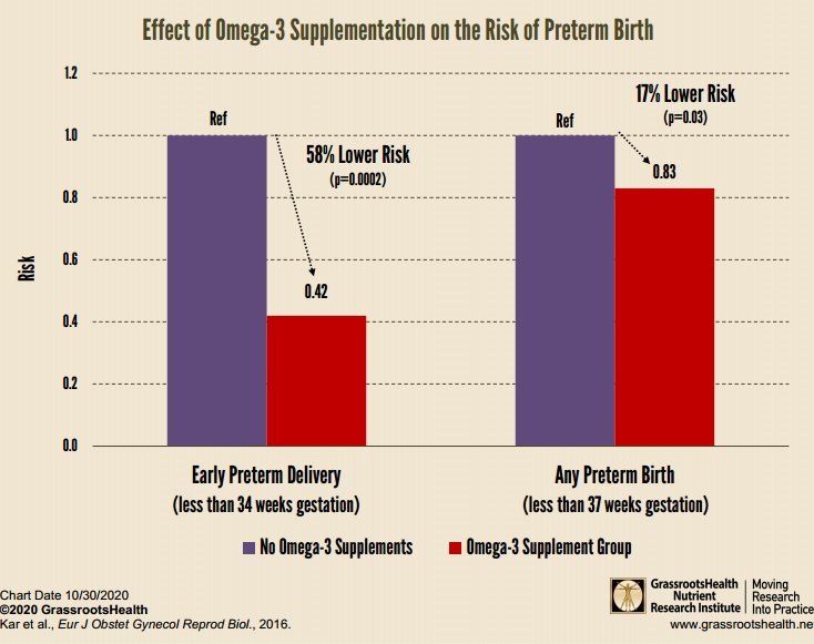 - "Supplementation with omega-3 long-chain polyunsaturated fatty acids (800 mg docosahexaenoic acid DHA and 100 mg eicosapentaenoic acid EPA per day) may reduce the risk of preterm birth among women who are low in omega-3."