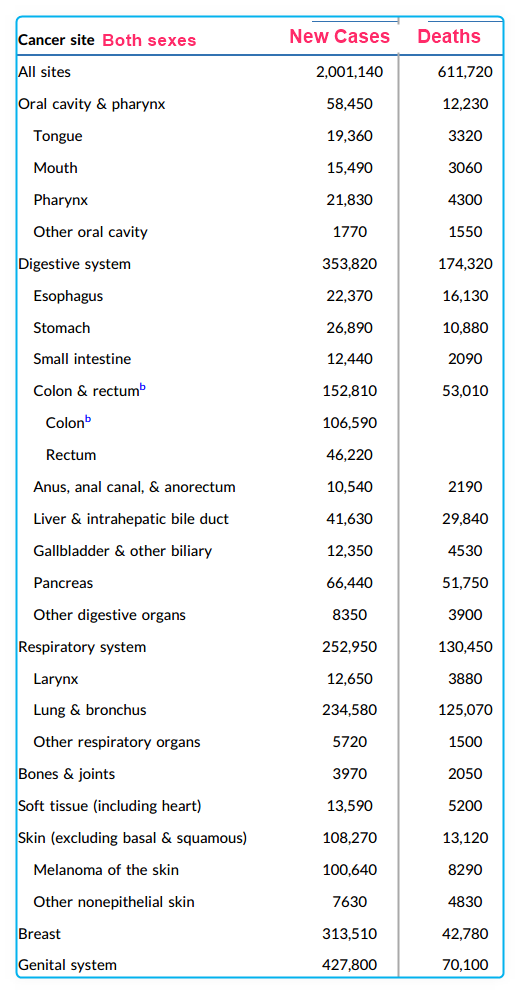 Each year, the American Cancer Society estimates the numbers of new cancer cases and deaths in the United States and compiles the most recent data on population- based cancer occurrence and outcomes using incidence data collected by central cancer registries (through 2020) and mortality data collected by the National Center for Health Statistics (through 2021). In 2024, 2,001,140 new cancer cases and 611,720 cancer deaths are projected to occur in the United States. Cancer mortality continued to decline through 2021, averting over 4 million deaths since 1991 because of reductions in smoking, earlier detection for some cancers, and improved treatment options in both the adjuvant and metastatic settings. However, these gains are threatened by increasing incidence for 6 of the top 10 cancers.