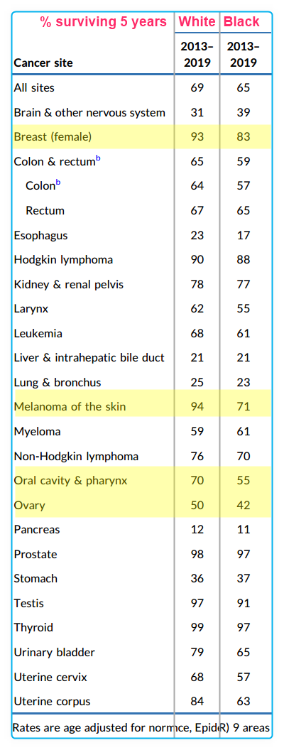 Progress is also hampered by wide persistent cancer disparities; compared to White people, mortality rates are two-fold higher for prostate, stomach and uterine corpus cancers in Black people and for liver, stomach, and kidney cancers in Native American people. Continued national progress will require increased investment in cancer prevention and access to equitable treatment, especially among American Indian and Alaska Native and Black individuals.