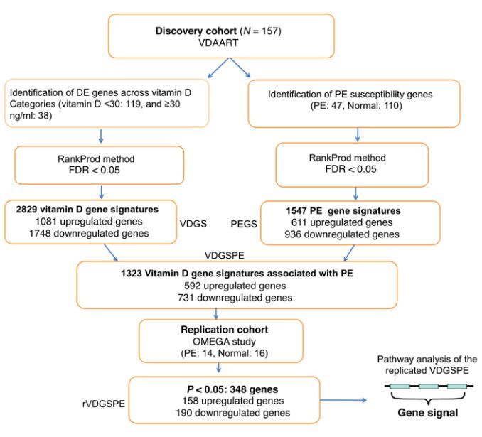 METHODS. We assessed the effect of vitamin D supplementation (4,400 vs. 400 IU/day), initiated early in pregnancy (10–18 weeks), on the development of preeclampsia. The effects of serum vitamin D (25-hydroxyvitamin D [25OHD]) levels on preeclampsia incidence at trial entry and in the third trimester (32–38 weeks) were studied. We also conducted a nested case-control study of 157 women to investigate peripheral blood vitamin D–associated gene expression profiles at 10 to 18 weeks in 47 participants who developed preeclampsia.