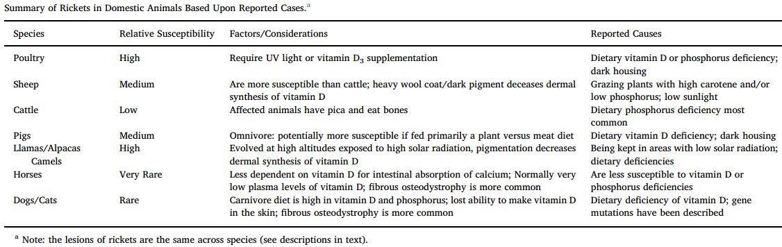 Although vitamin D is critical to calcium/phosphorus homeostasis, bone formation and remodeling, there is evolution-based variation between species in vitamin D metabolism and susceptibility to rickets and osteomalacia. Most herbivores produce vitamin D3 in response to sunlight, but dogs and cats have generally lost the ability as carnivore diets are rich in vitamin D. Nutritional deficiencies and/or poor exposure to sunlight can induce rickets in birds, swine, cattle and sheep, but horses are less susceptible as they have evolved a calcium homeostasis that is quite different than other animals. Adaptations to specific environments also affect disease incidence: llamas/alpacas out of their natural high altitude intense solar radiation environments are highly susceptible to vitamin D deficiency. The pathology of rickets/osteomalacia is similar across species, however fibrous osteodystrophy is more common and may also be present.