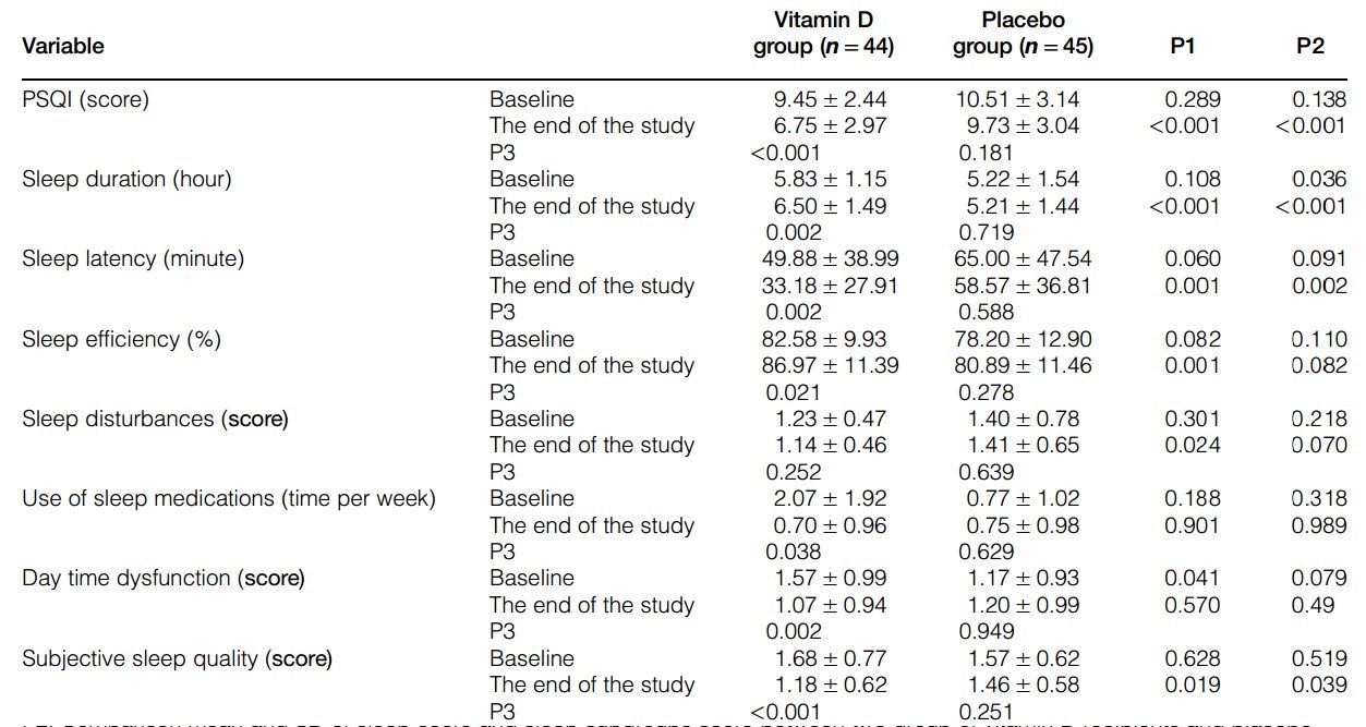 Findings: Based on the results of the present study, at the end of the study sleep score (PSQI) reduced significantly in vitamin recipients as compared with placebo recipients (P < 0.05). This difference was significant even after modifying confounding variables (P < 0.05).
