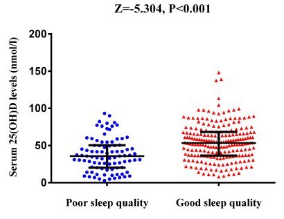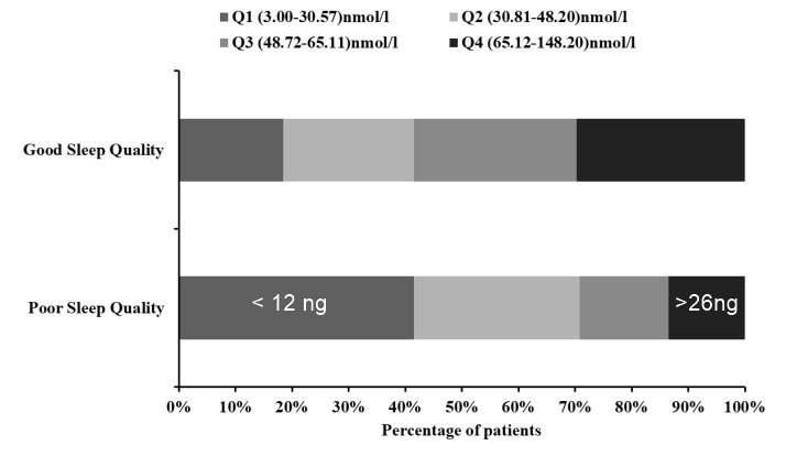 Methods: A total of 301 AIS patients were screened and completed 1-month follow-up. Serum 25-hydroxyvitamin D [25(OH)D] was used to assess the vitamin D status by a competitive protein-binding assay at baseline. All patients were divided into equal quartile according to the distribution of 25(OH)D. One month after stroke, sleep quality was evaluated by using Pittsburgh Sleep Quality Index (PSQI) and Epworth Sleepiness Scale (ESS) questionnaire; depression status was confirmed by 17-item Hamilton Depression Scale (HAMD).