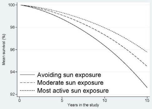 There were 2545 deaths among the 29,518 women who responded to the initial questionnaire. We found that all-cause mortality was inversely related to sun exposure habits. The mortality rate among avoiders of sun exposure was approximately two-fold higher compared to the highest sun exposure group, resulting in excess mortality with a population attributable risk of 3%.