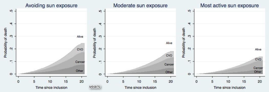 The longer life expectancy amongst women with active sun exposure habits was related to a decrease in CVD and noncancer/non-CVD mortality, causing the relative contribution of death due to cancer to increase.