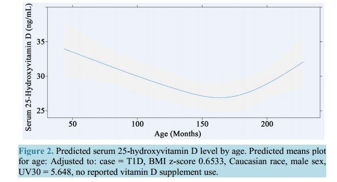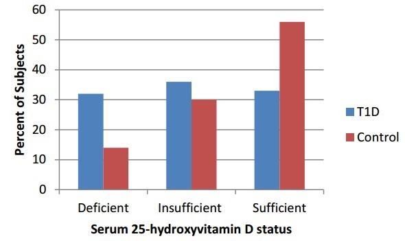 Conclusions: There is an increased prevalence of 25-hydroxyvitamin D deficiency and insufficiency in US. children with T1D compared with geographically similar children without diabetes. Further research is needed to determine whether decreased serum 25-hydroxyvitamin D can be alleviated via dietary or behavioral modifications in this population.
