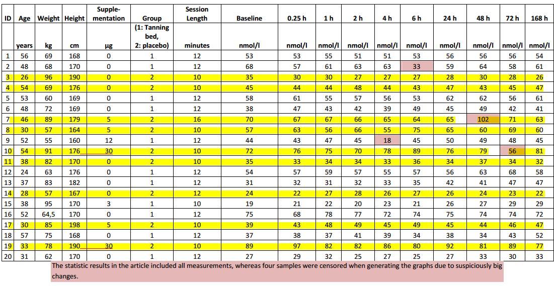 We wanted to evaluate the cutaneous synthesis of 25OHD and cholecalciferol after one whole-body exposure to ultraviolet radiation type B (UVB) in a randomized setup. Healthy volunteers were randomized to one whole-body exposure in a commercial tanning bed with UVB emission (UVB/UVA ratio 1.8-2.0%) or an identical placebo tanning bed without UVB. The output in the 280-320 nm range was 450 µW/cm². Blood samples were analyzed for 25OHD and cholecalciferol at baseline and during 7 days after treatment.