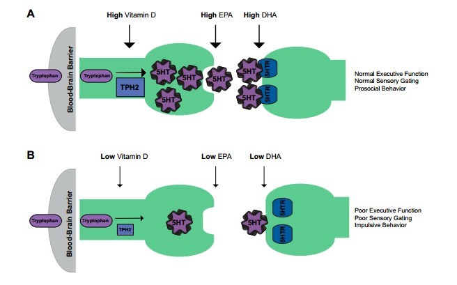 Importantly, because vitamin D regulates the synthesis of serotonin, EPA regulates its release from neurons, and DHA regulates serotonin receptor function, adequate vitamin D and v-3 fatty acid status would be critical to prevent defects in executive function, impulse control, sensory gating, and prosocial behavior, particularly in the context of a person with a polymorphism in a serotonin-related gene (Fig. 2A). Therefore, inadequate vitamin D and omega-3 fatty acid status, in combination with genetic factors that cause dysfunction in the serotonin pathway, may exacerbate defects and trigger mental illness (Fig. 2B). The timing of vitamin D and/or omega-3 deficiency in combination with genetic propensity for serotonin dysfunction is also likely to be an important determinant of whether mental illness will emerge. In fact, alterations in the migration of GABAergic interneurons during brain development, which is regulated by serotonin, is a key determinant for susceptibility to psychiatric disorders such as schizophrenia and autism (111). This may partly explain why neonatal vitamin D status is linked to the risk of schizophrenia (98, 120).