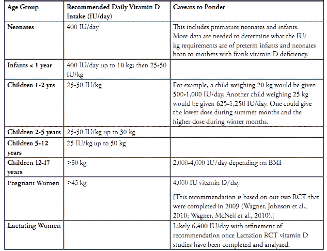 One size does not, nor will it ever, fit everyone. Variability in where one lives, one's diet, one's lifestyle, one's body composition (fat mass and lean body mass), and the season affect one's final vitamin D status. As the child grows, on a per kilogram basis, 400 IU/day is likely insufficient beyond a year, especially in those children with limited milk intake and sunlight exposure, in those with darker pigmentation, and who live at higher latitudes. With these caveats in mind, we can ask the question yet again: what should one do when it comes to vitamin D? The answer is found Table 1.