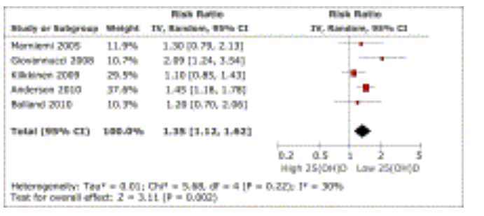 Figure 1. Forest plot of relative risks of coronary heart disease associated with the lowest 25 hydroxyvitamin D (25(OH)D) category compared with the highest (or reference) in cohort studies.