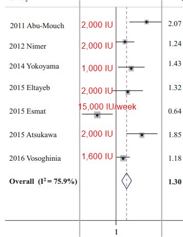 In summary, we observed that additional use of vitamin D has a positive effect on sustained viral response rates of patients with chronic hepatitis C infection. However, we cannot establish the efficacy because of substantial heterogeneity, a small sample size and a low methodological quality.