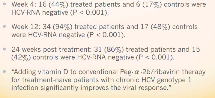 Adding vitamin D to conventional Peg-α-2b/ribavirin therapy for treatment-naïve patients with chronic HCV genotype 1 infection significantly improves the viral response.PMID: 22215943